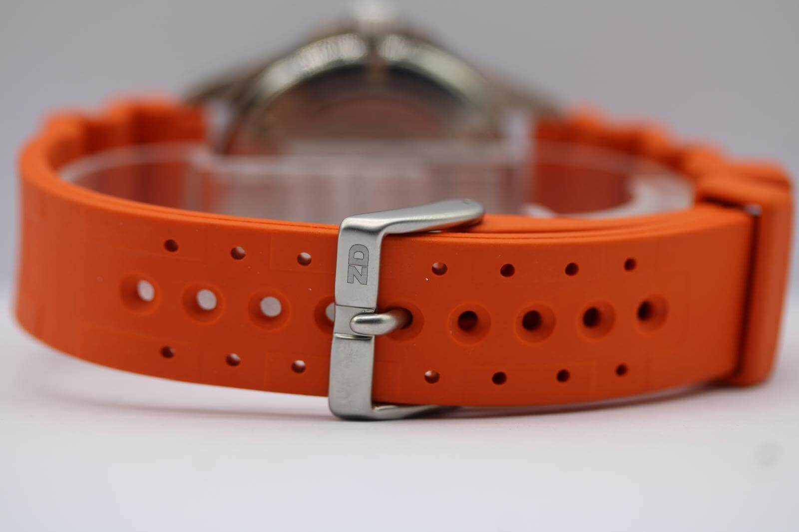 Strap: Orange rubber strap (aftermarket, currently fitted)
