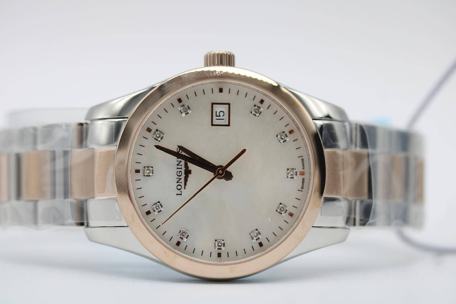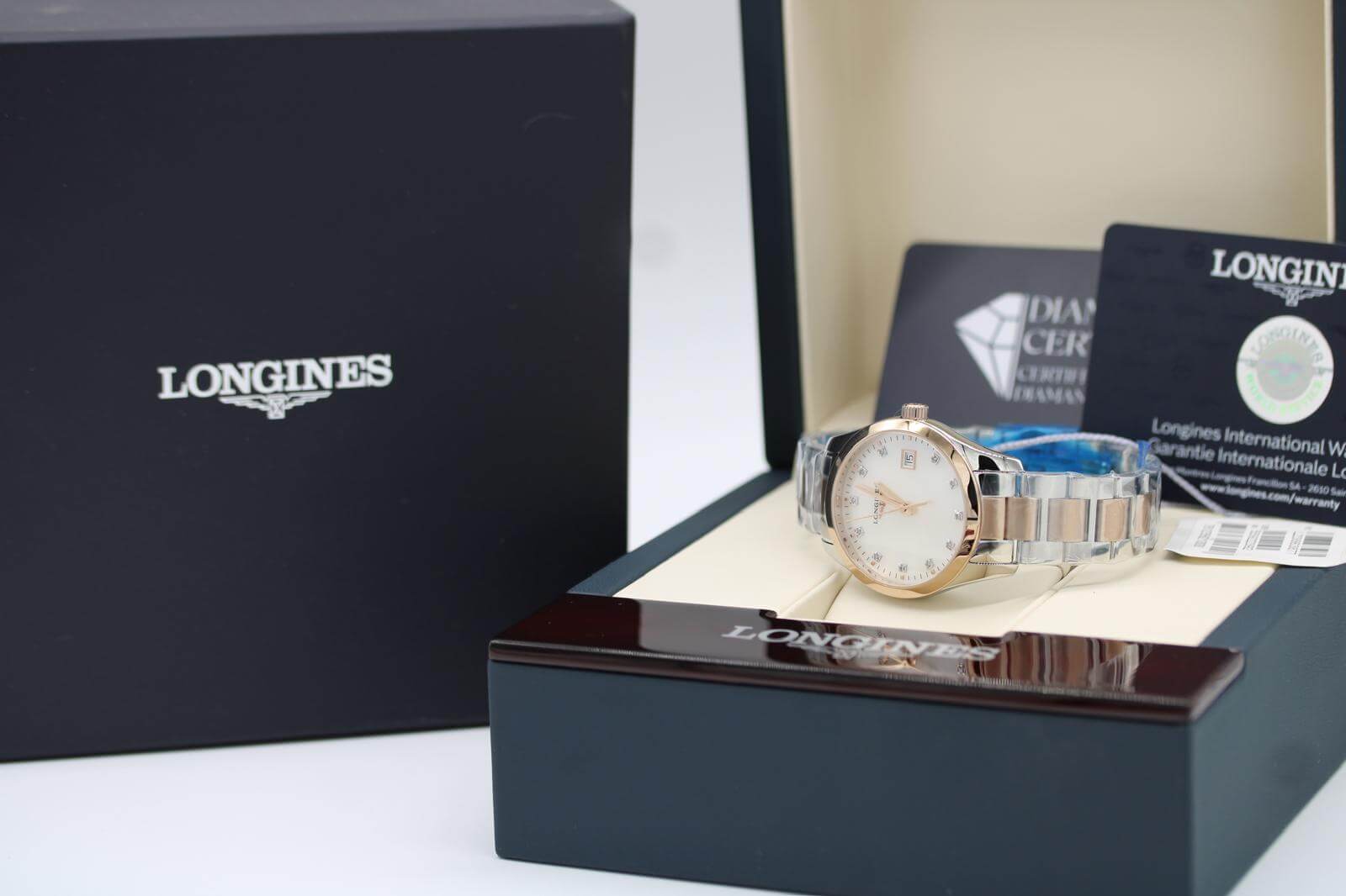 This is the 34mm version of the Conquest Classic (larger than the 29.5mm alternative), making it a superbly balanced size on the wrist. The elegant mother-of-pearl dial is set with factory diamonds as hour markers and paired with subtle rose-gold-tone accents, achieved through red PVD coating on the stainless steel case and bracelet.