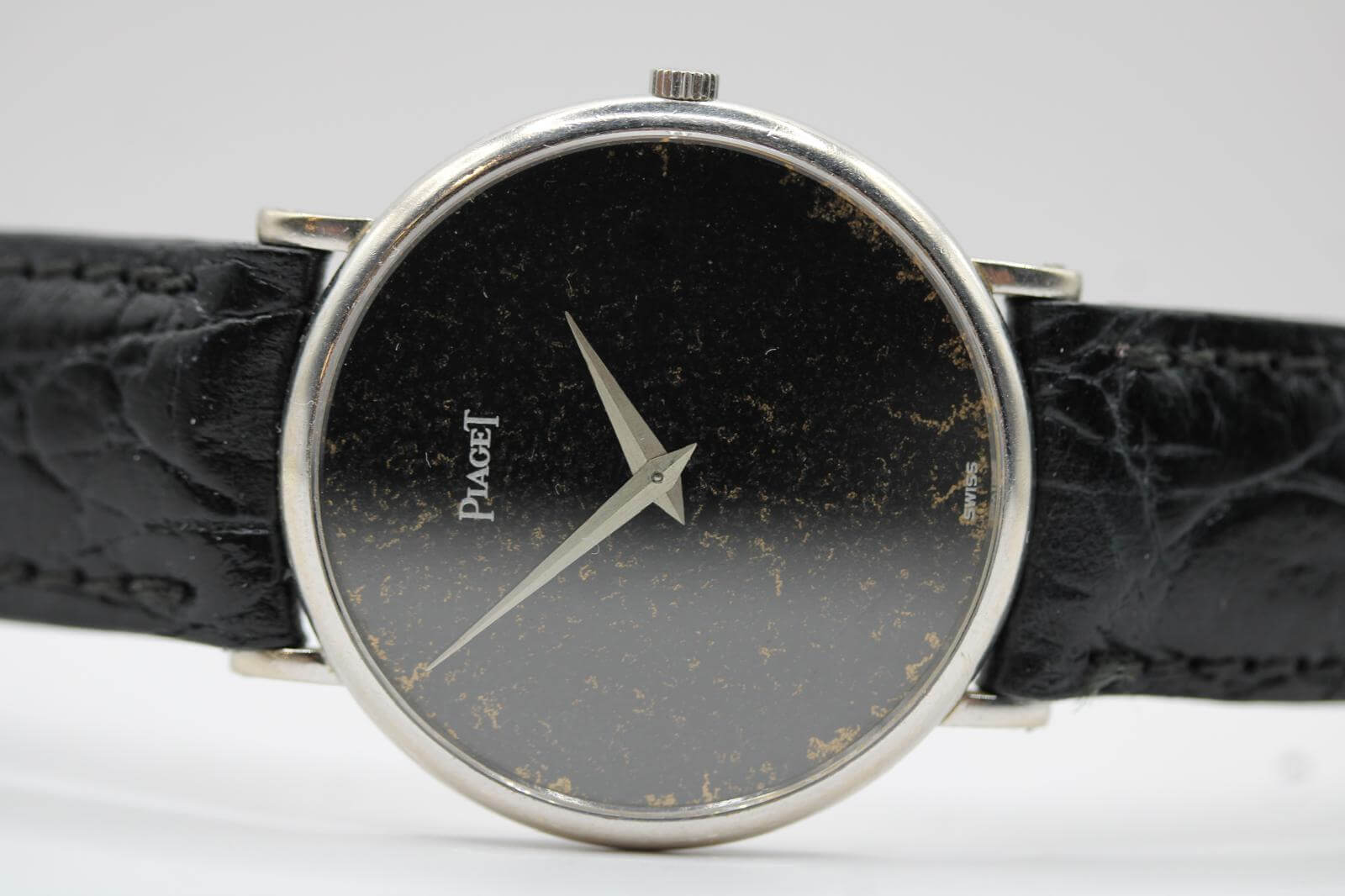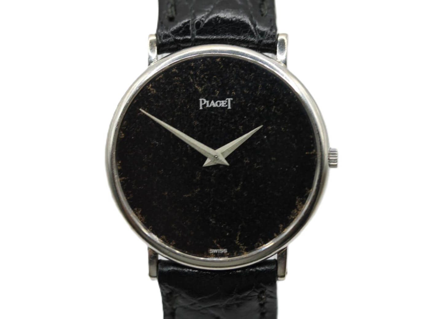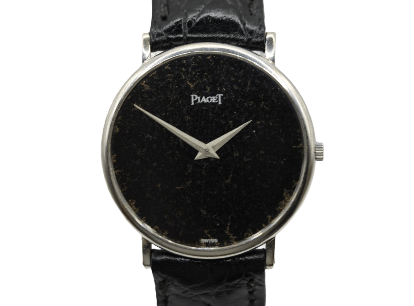 The Piaget Altiplano 9025 is a true expression of 1970s high luxury, defined by purity of form and technical brilliance. The legendary Calibre 9P was a pioneer of ultra‑thin watchmaking, and its influence is still felt today. The minimalist black dial, free of markers, elevates this piece to something quietly exceptional. With box, papers and original white gold buckle, this is a watch worthy of any serious collection and a lasting testament to Piaget’s mastery of refined watchmaking.