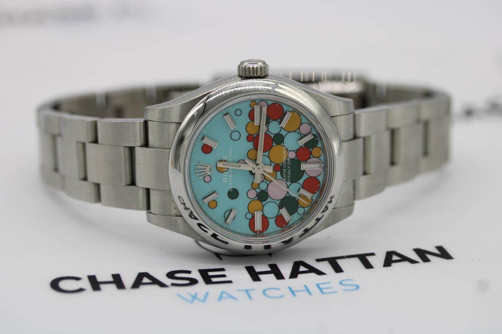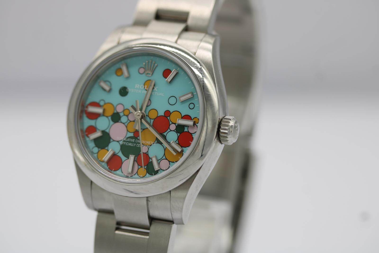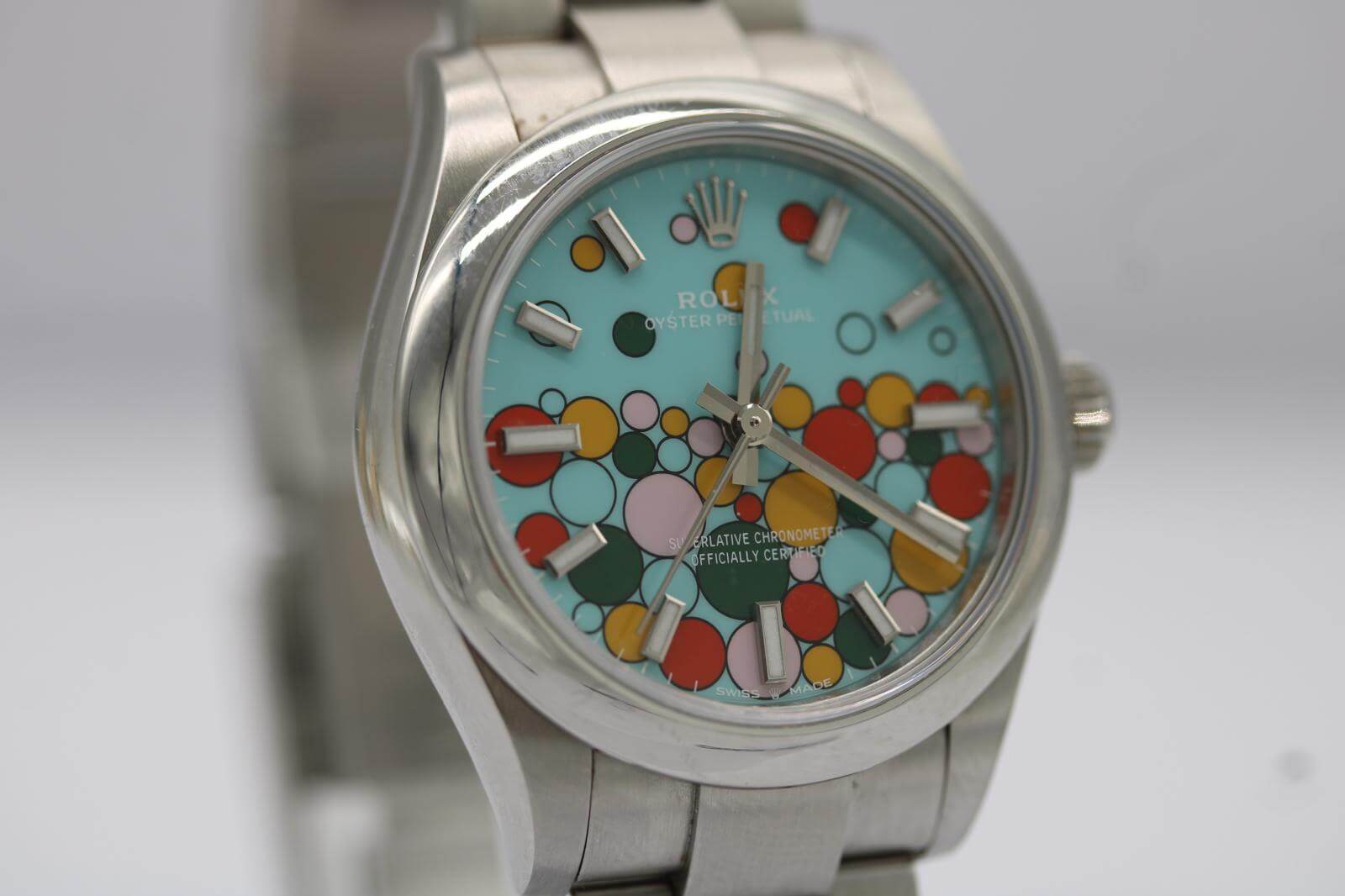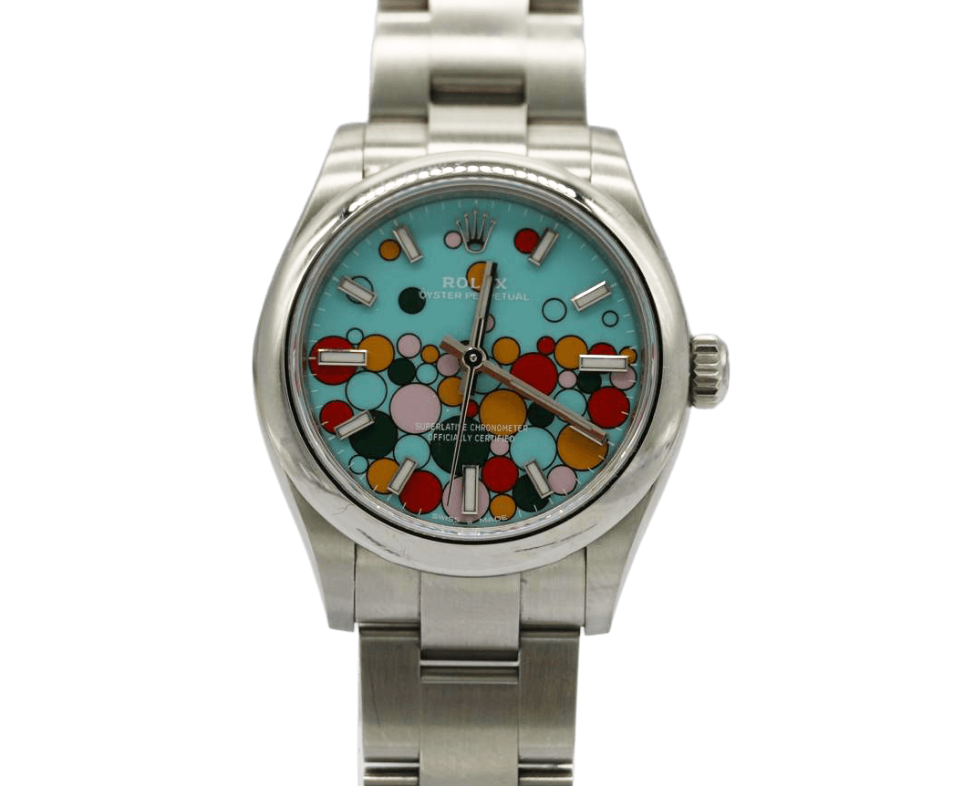 The Rolex Oyster Perpetual 31 Ref. 277200 “Celebration Dial” has become one of the most sought-after modern Rolex releases — a bold, playful design that has already earned cult-classic status. Now discontinued, this model is particularly collectible in the 31mm configuration, striking the perfect balance of size, wearability, and vibrant aesthetic appeal.