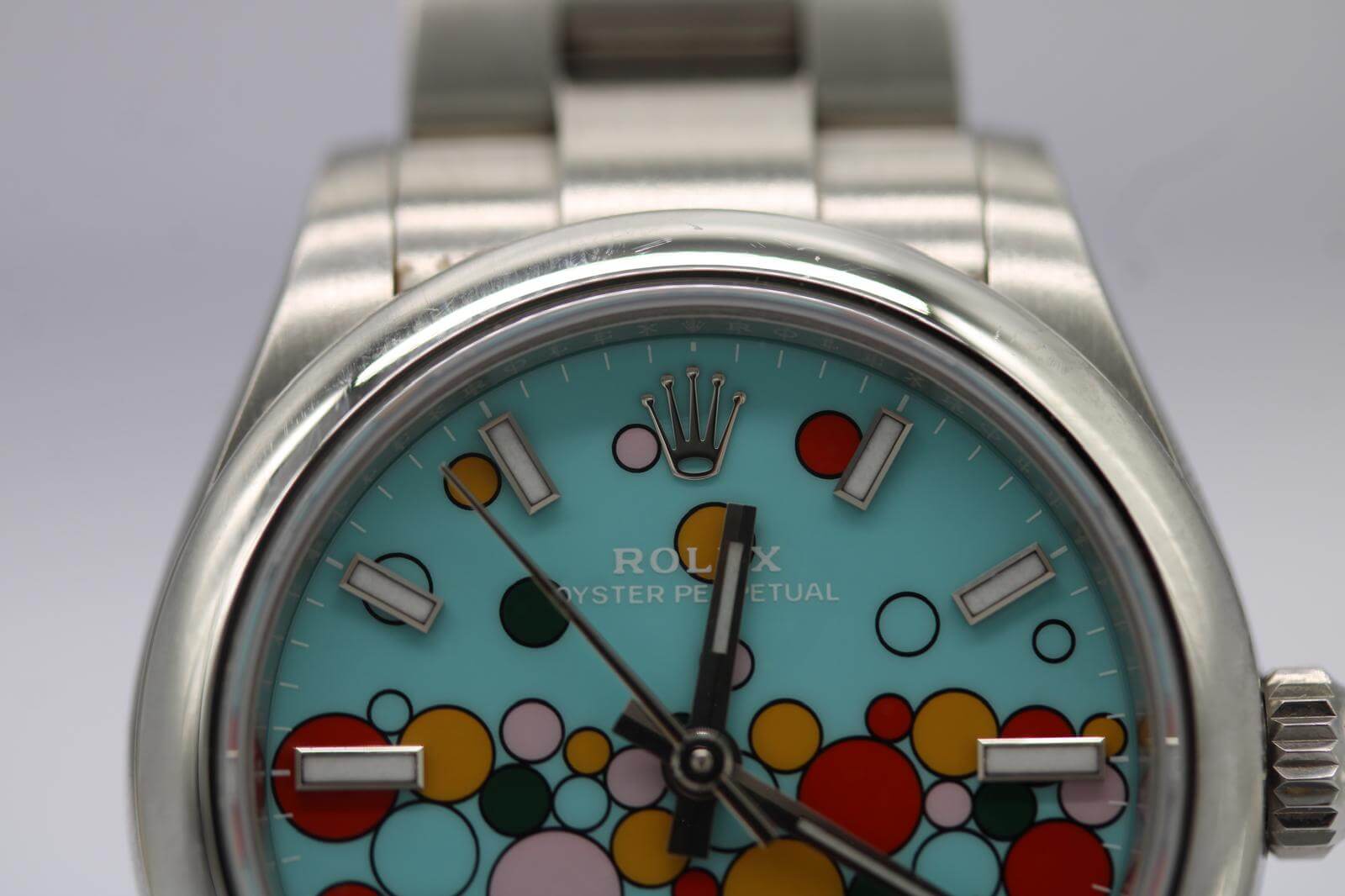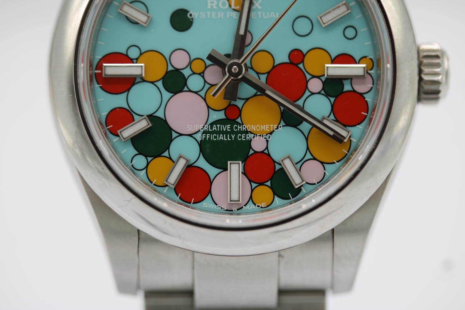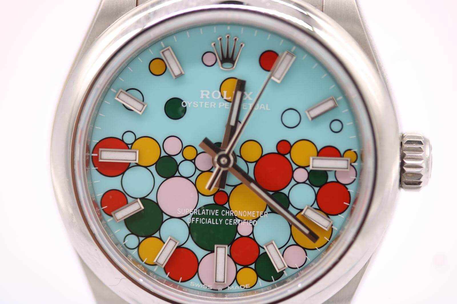 The 31mm stainless steel case features a smooth steel bezel and the instantly recognisable blue Celebration dial — a joyful pattern of colourful bubbles surrounding luminous baton hour markers. Fitted to a full-length Oyster bracelet with folding clasp, this piece embodies the spirit of contemporary Rolex design: playful, precise, and timelessly robust.