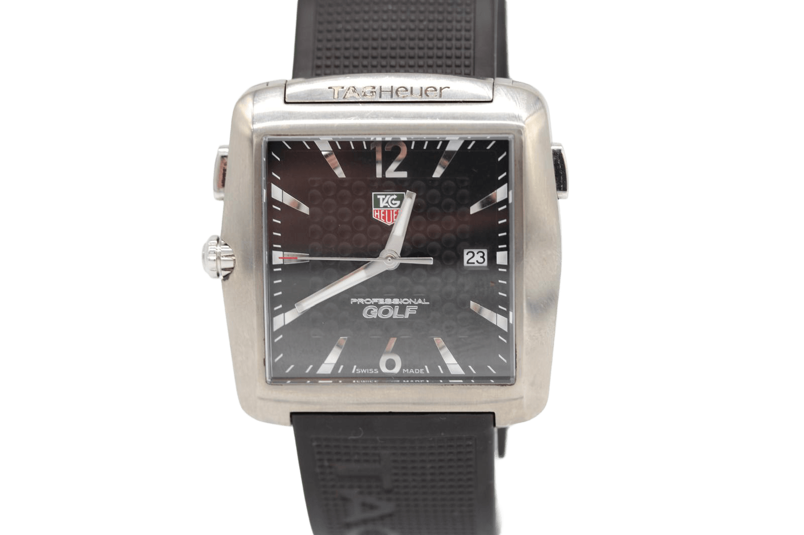 A highly collectible TAG Heuer Professional Golf Tiger Woods Edition, reference WAE1111/0. Designed in collaboration with Tiger Woods and engineered specifically for comfort and performance on the golf course, this model is ultra‑light, ergonomic and instantly recognisable. With its titanium construction, black textured dial and unique strap system, it remains one of TAG Heuer’s most innovative and sought‑after sport references.